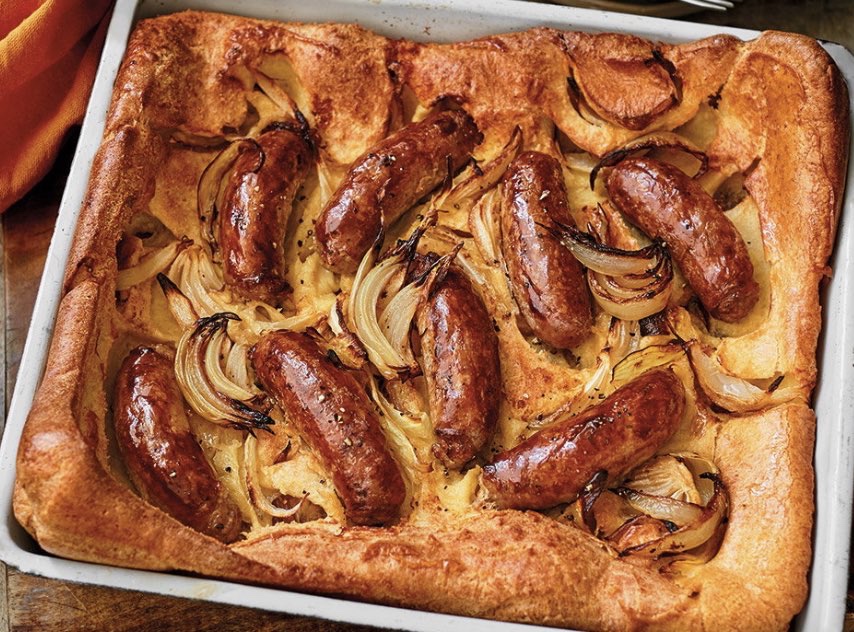Y sin dejar las salchichas pasamos al ‘Toad in the Hole’, una receta de aprovechamiento puro que se suele preparar para los niños. En una fuente de horno, pones las salchichas cocinadas y añades la misma masa del Yorkshire Pudding y horneas, obteniendo así una especie de Coca menos crujiente