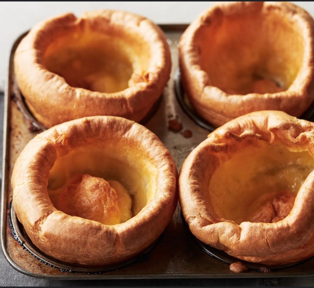 ‘Yorkshire Pudding’, una especie de buñuelo con forma de vaso, para verter salsa dentro, indispensable para cualquier asado. A base de huevos, harina, leche y tradicionalmente grasa de ternera para cocinarlos en su molde. Al hornearlos crecen, quedando crujientes y esponjosos