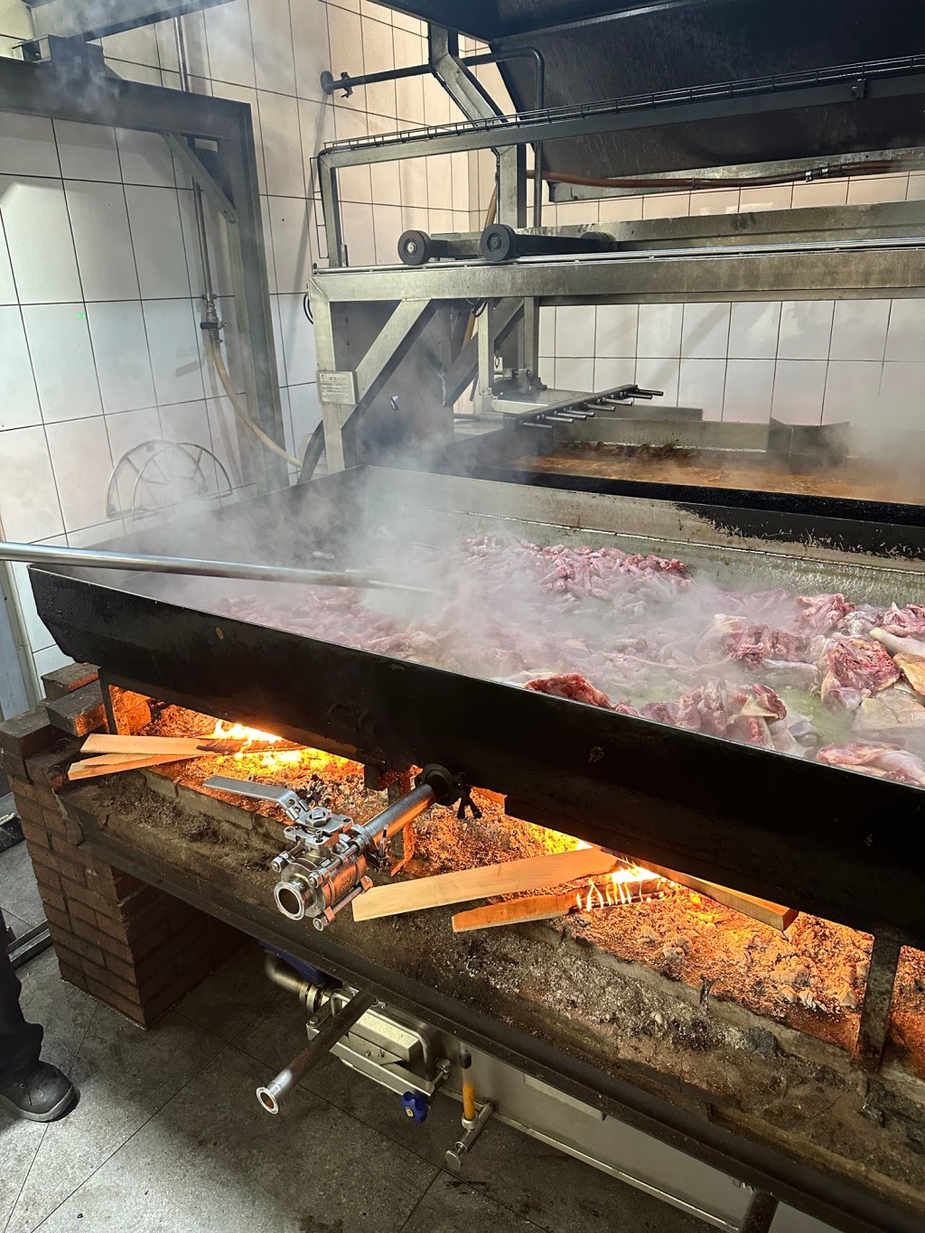 Están en mitad de proceso de elaborar el caldo, reducido, de carne. Para ellos dorar en estas paellas rectangulares gigantes los ingredientes, como harías tú en tu casa a la hora de hacer una paella cualquiera. Que la caramelización y reacción de Maillard sea la mejor y de un buen sabor. A continuación se desglasaría el caldero con una salmorreta muy básica: tomate triturado, pimentón y ajo. Añadir agua y a cocer. Recetas simples, bien ejecutadas que elaboran los distintos equipos que pasan por allí.