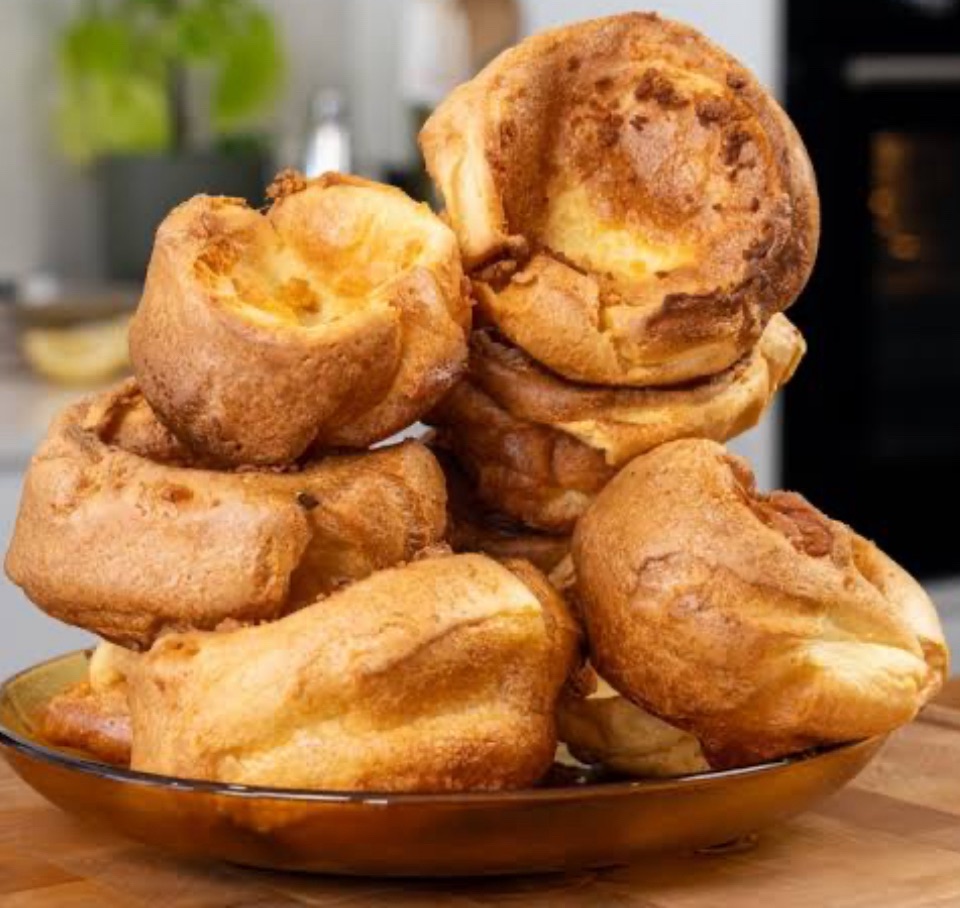 Los Yorkshire puddings, son el sustituto a nuestro pan, y son una mezcla de harina, huevos y leche, que se hornean en moldes especiales y suben durante su cocción formando unos bollos “huecos” donde viertes la salsa y lo acompañas de guarnición. Se cree que surgieron antes del siglo XVI cuando empezó a divulgarse el uso de la harina para sus puddings, y en su origen servían de entrante (empapados en salsa, o con los jugos de la carne que se presentaba como segundo plato) y tenían el objetivo de llenar los estómagos de la gente antes incluso de que llegase la carne (para familias con poco poder adquisitivo).